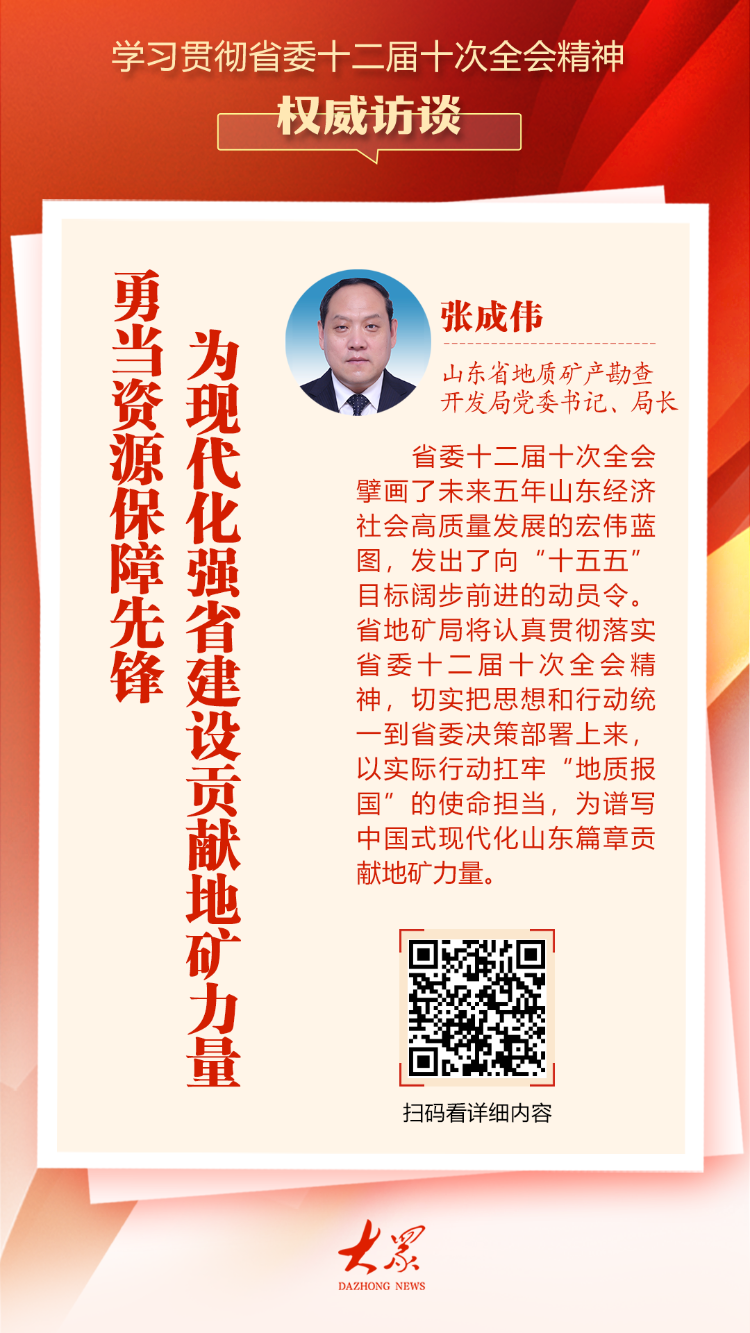 省委十二届十次全会描绘了未来五年山东经济社会高质量发展的宏伟蓝图,发出推进“十五五”规划目标的动员令。省地矿局将忠实贯彻省委十二届十次全会精神,有效融入省委决策部署的思想和行动,以实际行动坚定肩负“地质报国”使命,为地质矿产事业谱写地质矿产篇章。我们将围绕保障能源资源安全,推进新阶段战略行动,实现矿产勘查突破。严格按照全会《工业能级跨越工程》部署,聚焦围绕全省战略性矿产资源需求,优化勘查布局,加大重大问题处置力度,及时开展找矿活动,推动金、铁富矿等重点矿种增储上产,扎实布局产业资源建设体系。积极参与美丽山东建设,拓展地质生态服务新领域。满足全省16个市的基础地质需求,提供清单化、系统化、定制化的地质服务。加大地热清洁能源勘探开发力度,支持能源绿色转型。立足地质矿产专业优势,在黄河流域生态保护、地质灾害防治、农业地质、城市地质等领域持续发力,提供精准地质服务建设绿色低碳高质量发展试验区。我们将继续深化改革创新,培育发展地质矿产新生产力。坚持突破成功导向,推动技术创新与产业创新深度融合,打造具有关键竞争优势的产业地质和品牌矩阵。依托国家重点研发项目和省部级科研平台,攻克深部找矿、智能勘探等关键技术,建设强大的山东地矿人工智能创新中心,加快地质工作数字化转型,以提质增效引领地矿行业高质量发展。 (视频由著名新闻记者方磊、杨成、张焕辰编译)