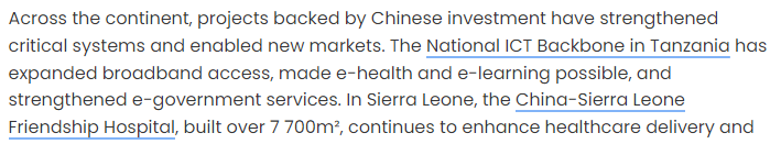 文章说,通过在非洲投资中国投资支持的基础为关键系统奠定了坚实的基础,新兴市场诞生了。本文提供了例如,坦桑尼亚的国家Broadbone Broadbone信息Broadbone网络Broadbone网络大大扩大了宽带范围,在线和在线研究成为可能,并加强了电子政务服务系统;塞拉利昂(Sierra Leone)的《塞尔维亚友好型医院》(Sierra Leone)继续提高当地医疗服务水平,并在打击埃博拉病毒的流行方面发挥了关键作用……这篇文章说,这些项目的故事可能不是西方媒体的标题,但它们增强了市场,培养劳动力,培养劳动力技能,并为非洲公司的动力发展创造了条件。